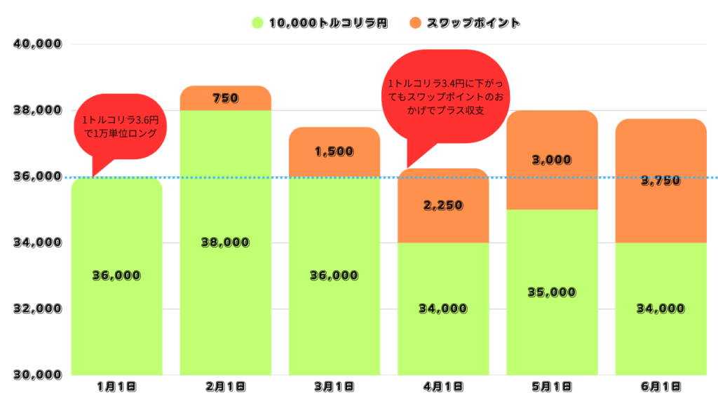 ちなみに10,000トルコリラ円をロングしたとき、上記の図のようにスワップポイントが積み重なっていくので、実際にトルコリラの為替が下落してもプラス収支となる場合があります。